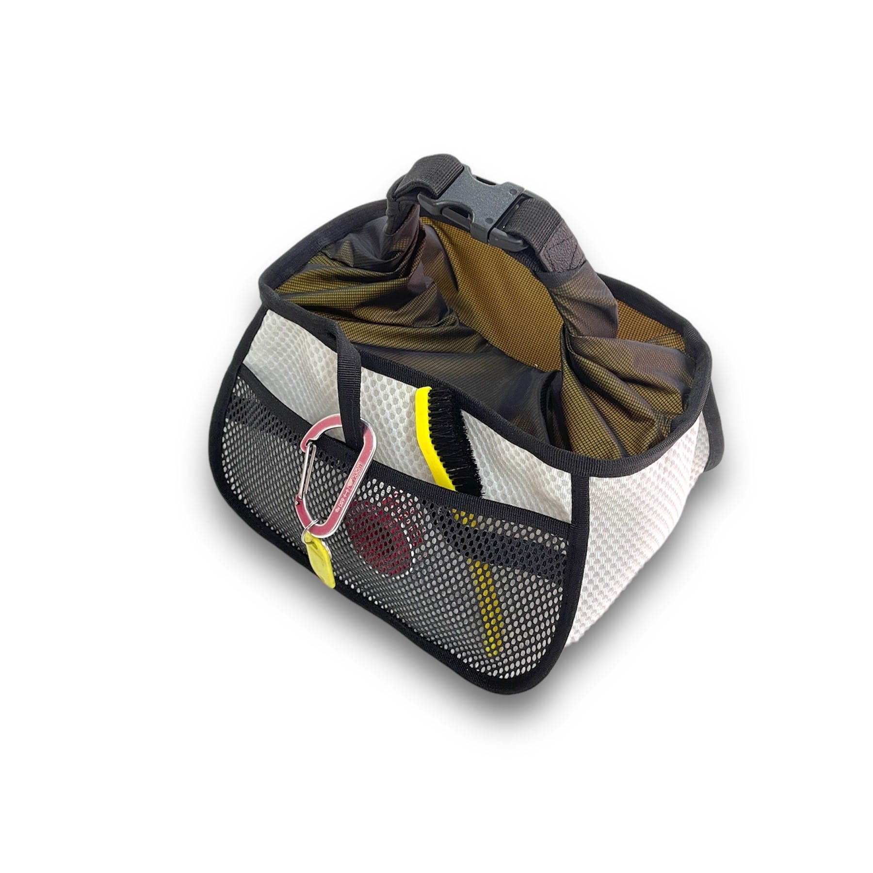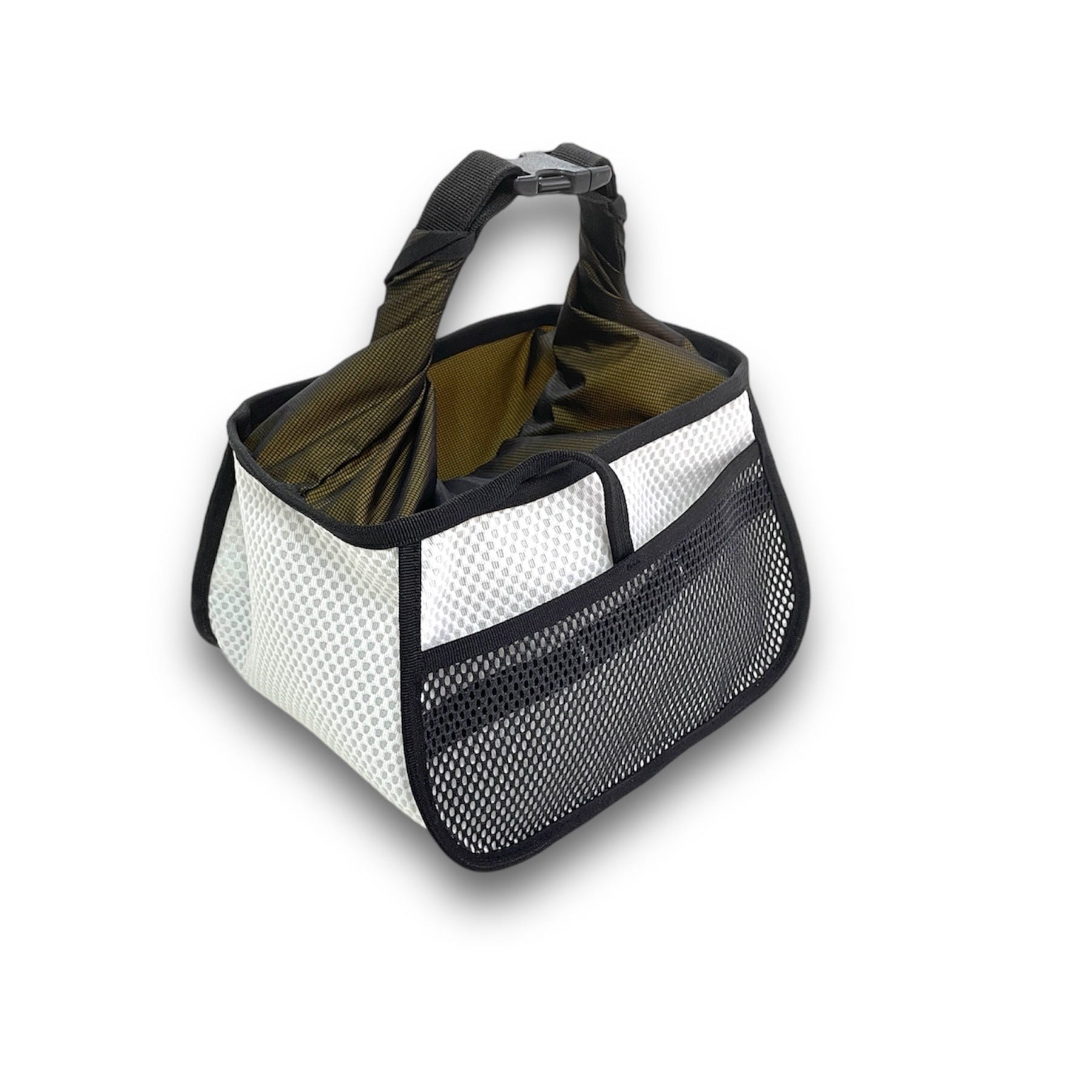 - Large mesh pocket on the back of the bag with an internal strap to stabilize accessories